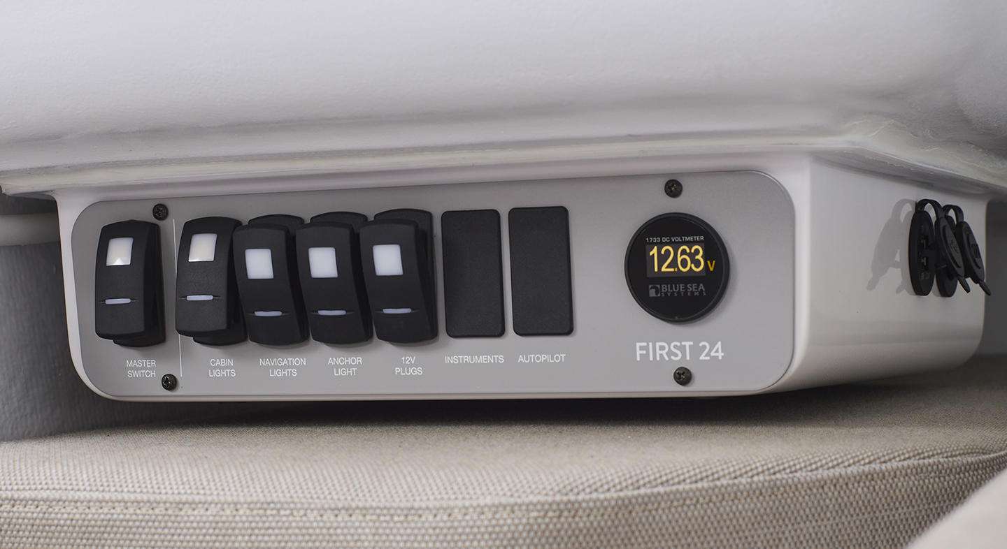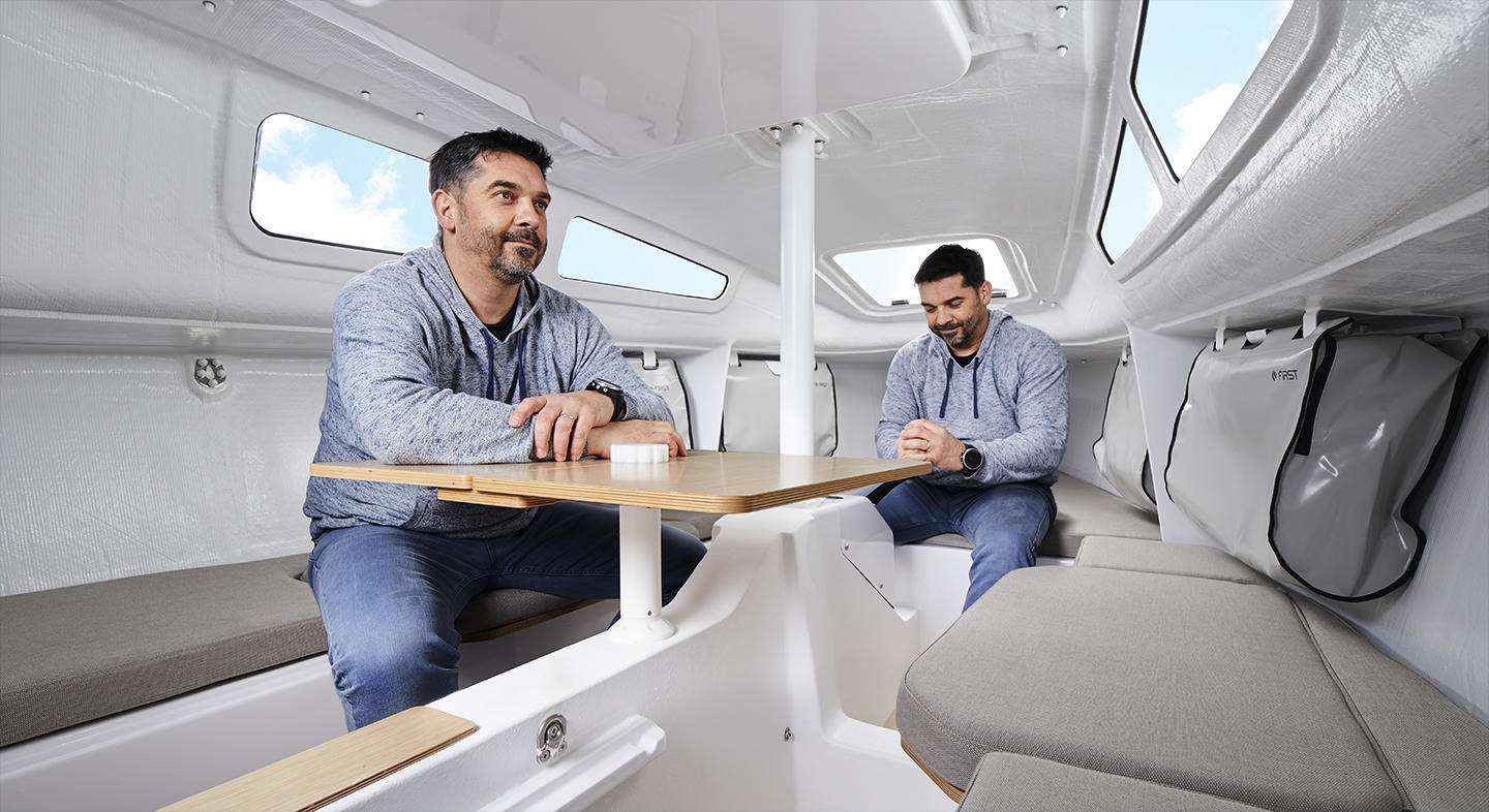 Das Interieur der First 24 ist offen gestaltet und bietet allen Komfort für angenehme Aufenthalte an Bord. 4 Erwachsene können hier übernachten und ein klappbarer Tisch ermöglicht gemeinsames Essen in Salon oder Cockpit. Eine Chemietoilette ist optional erhältlich.