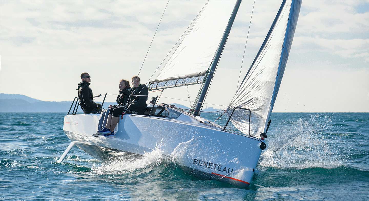 Das Interieur der First 24 SE ist minimalistisch gehalten, auch was das Gewicht der Ausstattung betrifft. Dennoch bietet das Boot jeglichen Komfort, den man sich von einem Segler dieser Größe wünschen kann. Es gibt vier Schlafplätze für Erwachsene, abnehmbare Gepäcktaschen, Stauraum unter den Sitzbänken und einen Klapptisch, um im Salon oder im Cockpit zu essen.