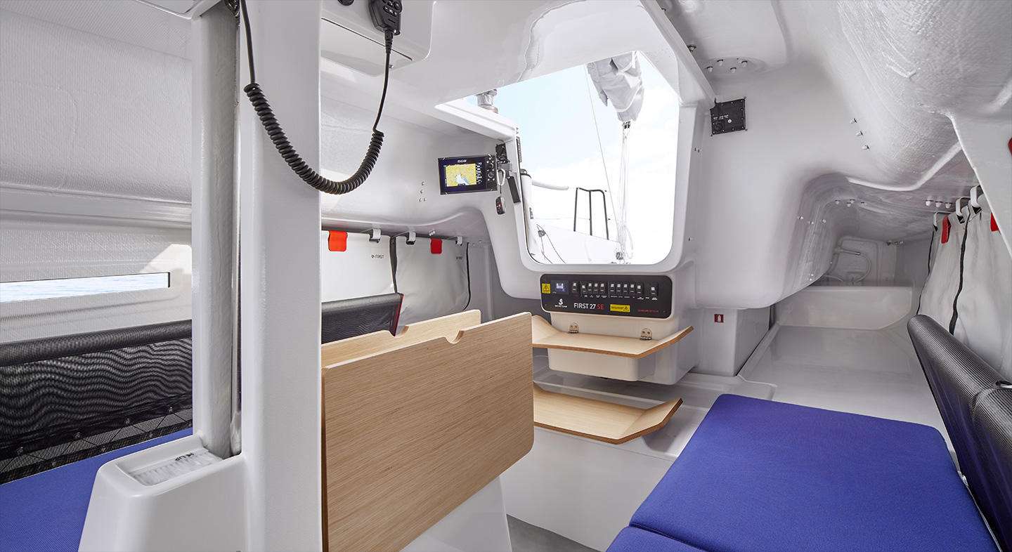 Die First 27 SE ist einzigartig auf dem Markt. Sie ist das einzige trailerbare Boot ihrer Kategorie (B8) mit voll funktionaler Ausstattung. Und auch wenn sie sehr minimalistisch wirken mag, sie bietet 6 Erwachsenen Platz. Die separierte Bugkabine hat Raum für zwei Personen, vier weitere können im Salon schlafen.