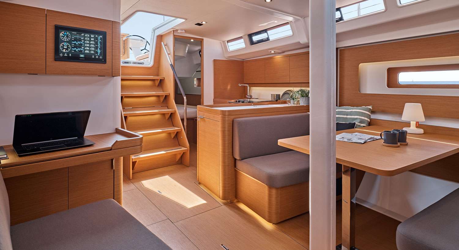 Die First 44 verfügt über eine helle, moderne und puristische Inneneinrichtung, die weißen Lack, Formholzteile und gepflegte Polstersitze verbindet.
