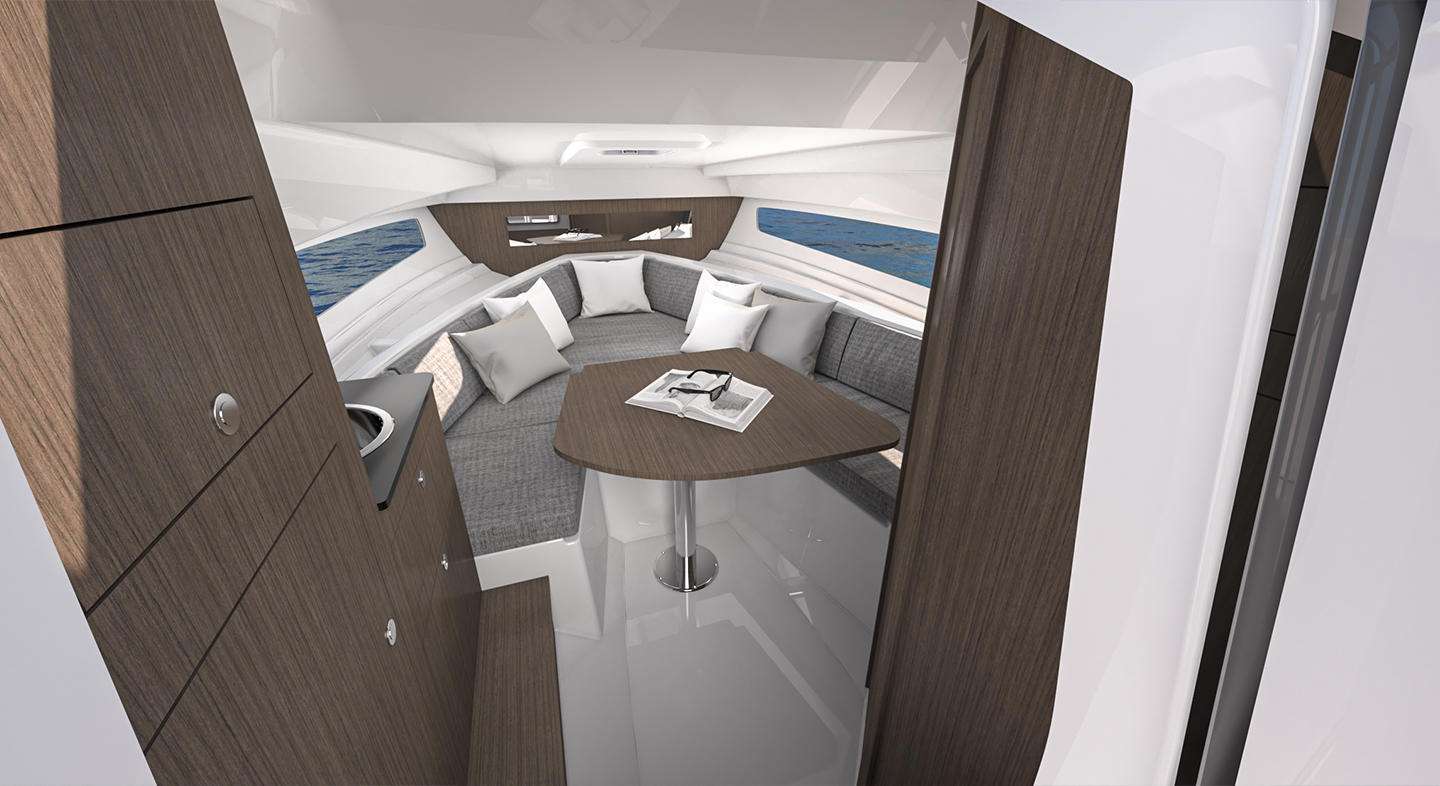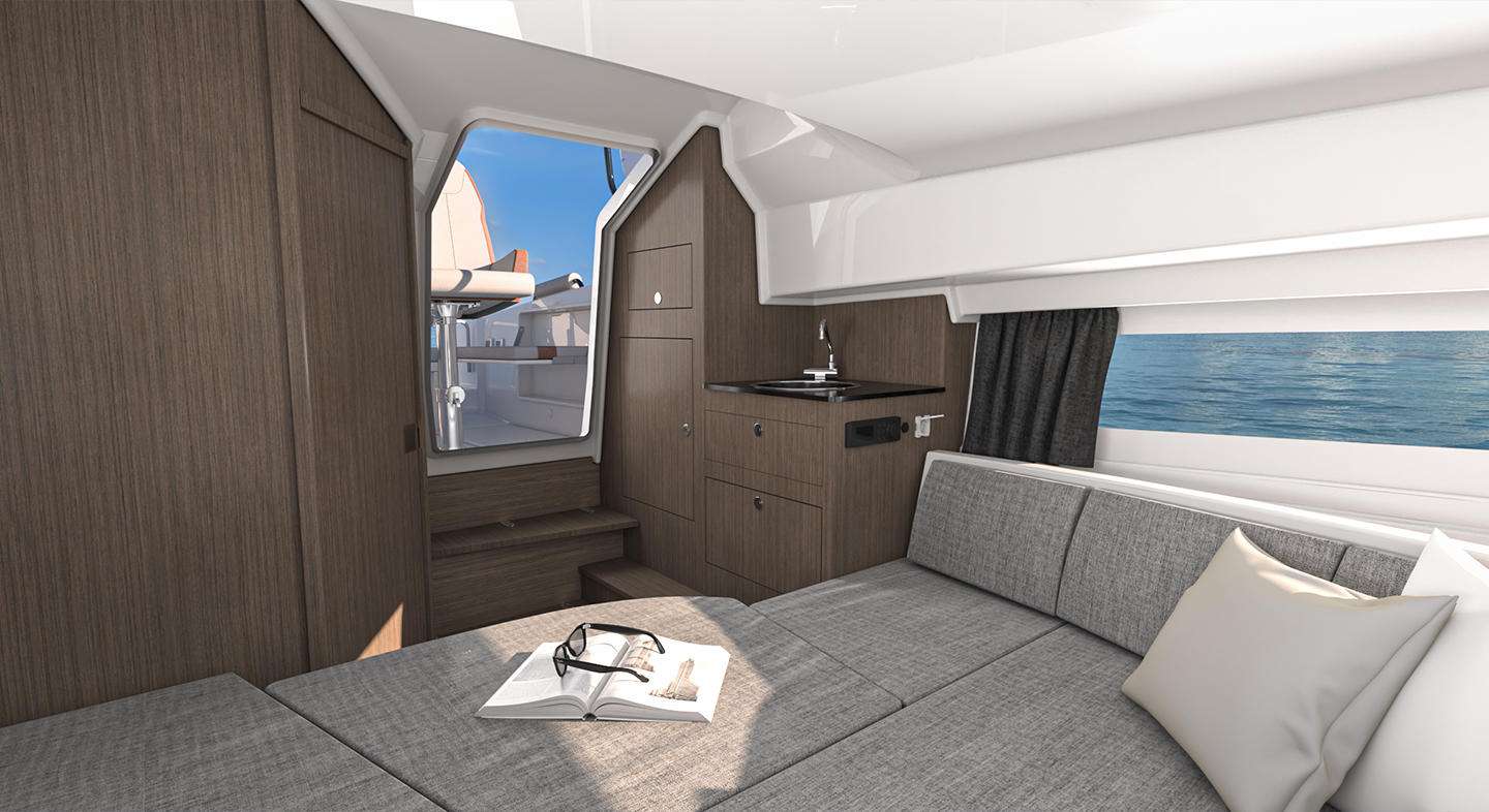 Die Kabine der Flyer 8 SUNdeck ist gut ausgestattet und dank der Öffnungen gut belüftet. Ein richtiger Aufenthaltsraum, in dem man sich zu jeder Tageszeit erholen kann.