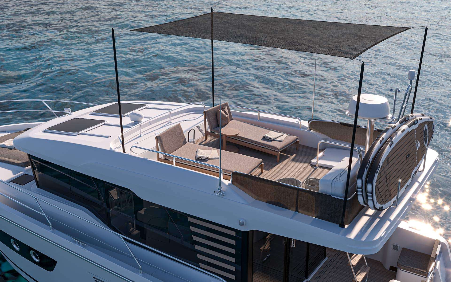 Standardmäßig mit integrierten Stromanschlüssen ausgestattet, lässt sich dieser Bereich optional mit einem Sonnensegel oder Holzlattenboden ausstatten und verwandelt sich in eine stilvolle Lounge-Terrasse, auf der Sie entspannen und den Blick in die Ferne genießen können.