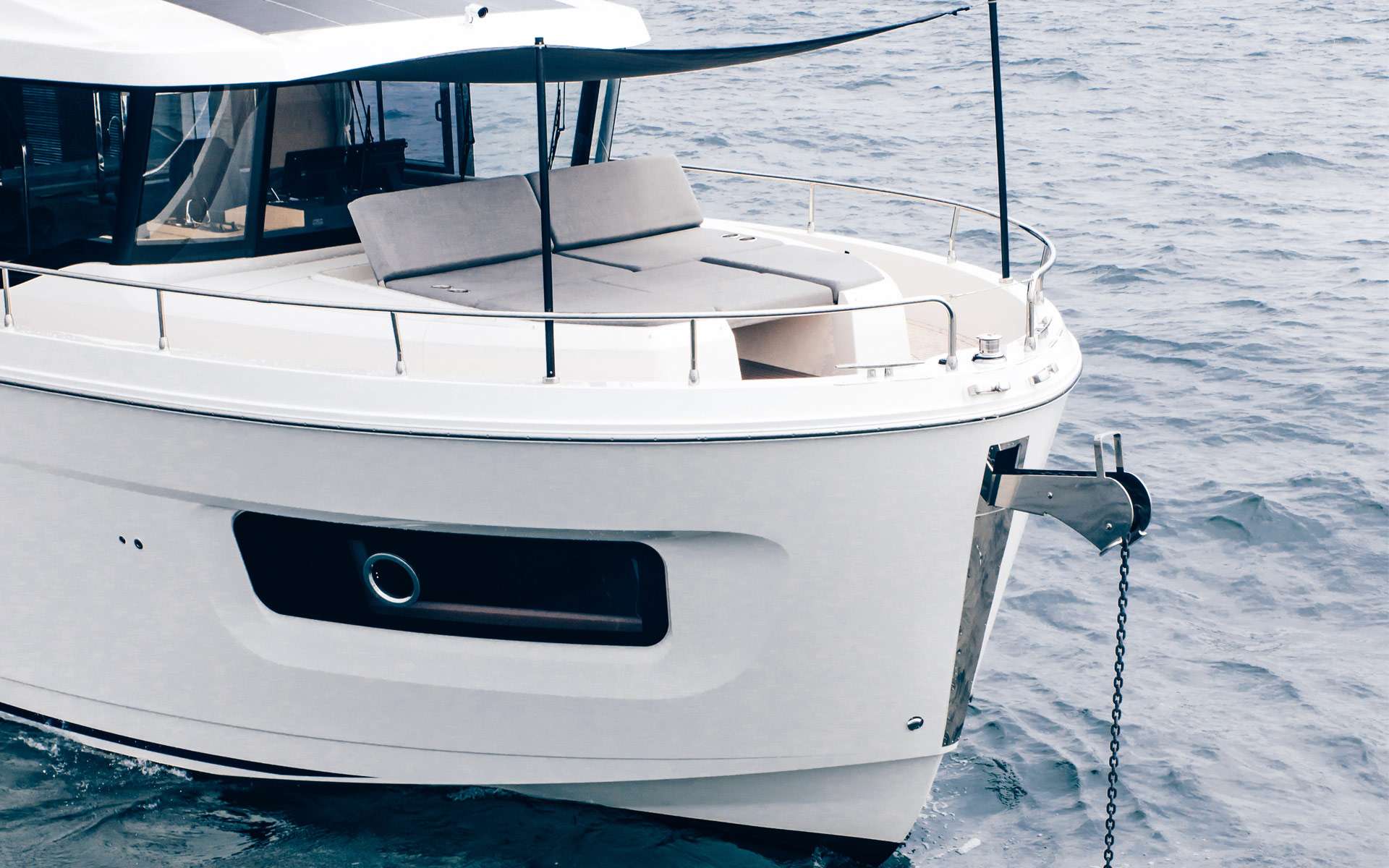 Das Vorderdeck bietet drei Nutzungsmöglichkeiten: ein großzügiges Sonnendeck, einen geselligen Wohnbereich mit Tisch sowie Stauraum für Festmacher und Fender.