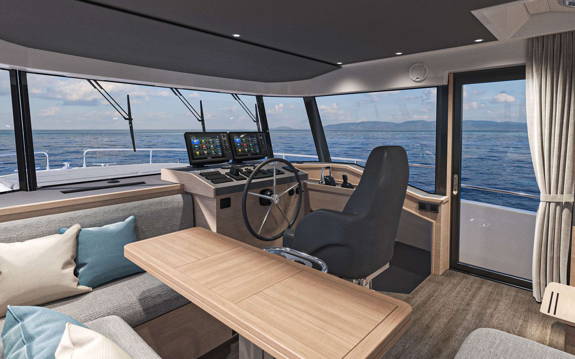 Der Innenraum, in dem jedes Element auf Komfort und eine optimierte Nutzung ausgelegt wurde, umfasst eine funktionale Einbauküche mit erhöhtem Sitzbereich sowie einen großen Salon. Eine Eignerkabine mit Queensize-Bett, eine Kabine für zwei Gäste im vorderen Bereich und eine dritte, modulare Kabine mit zwei Einzelbetten bieten die perfekte Ausstattung für ausgedehnte Kreuzfahrten mit der Familie oder mit Freunden. Die Sitzgelegenheiten im Steuerhaus lassen sich außerdem in einen Schlafplatz umfunktionieren, was Sie auf längeren Fahrten schätzen werden. Die Eignerkabine verfügt über einen großen eigenen Waschraum mit geräumiger, separater Dusche, Toilette und vielen Staufächern. Ein zweiter Waschraum ist von den übrigen Kabinen und von den Gemeinschaftsräumen aus zugänglich.
