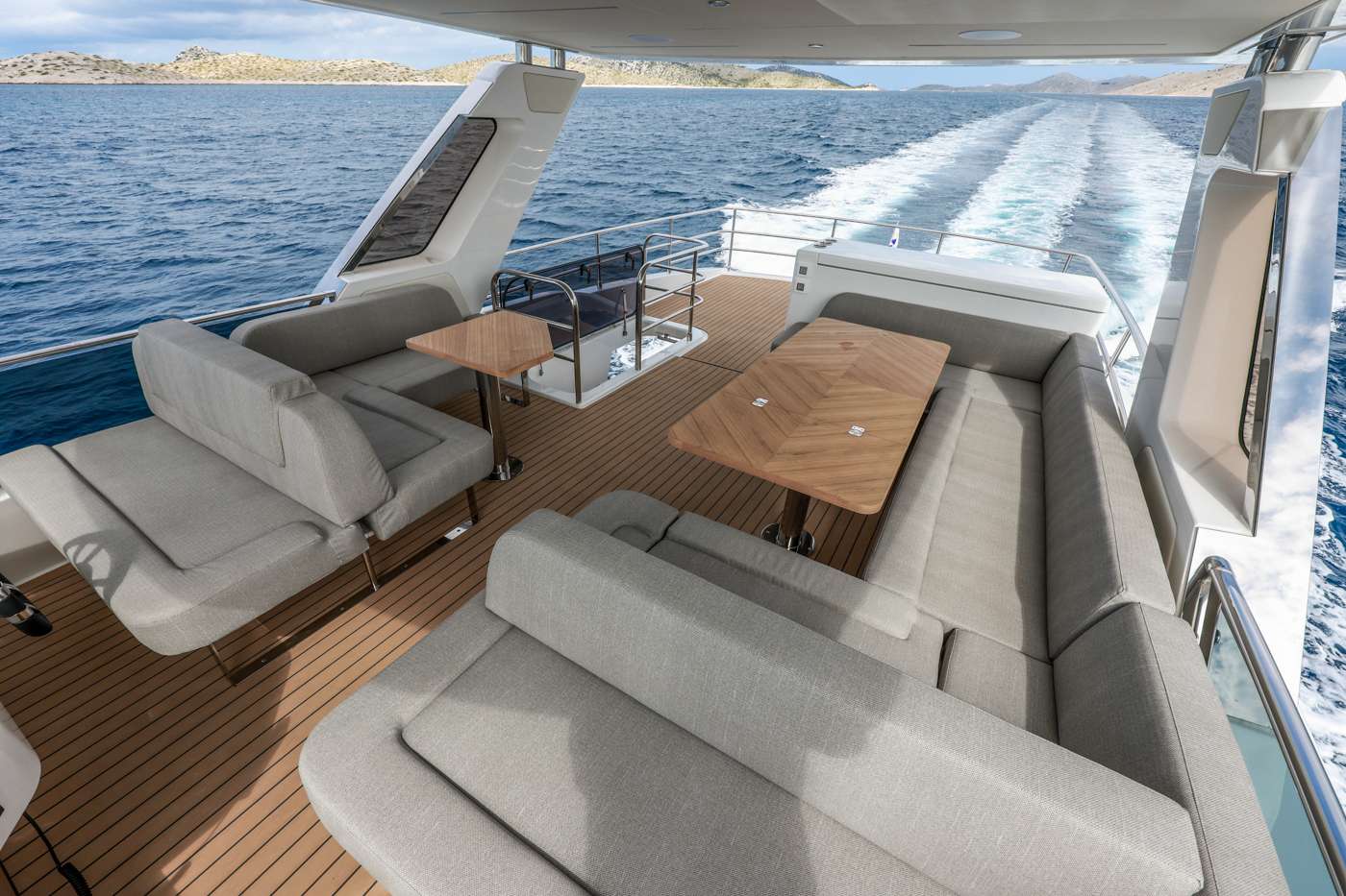 Enjoy the sun in more comfort than ever! The integrated stern bench at the beach club area brings summer vibes to the bathing platform of your Greenline 58 Fly.